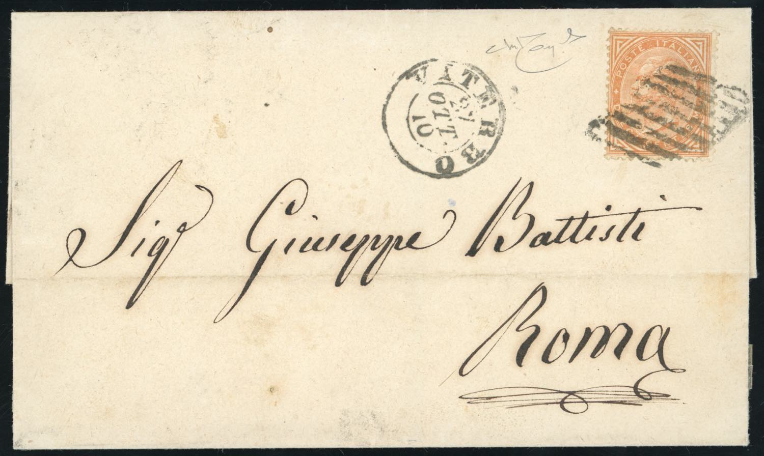 1870 - 10 cent. De La Rue (T17), perfetto, su sovracoperta di lettera da Viterbo 27/10/1870 a Roma. Bella. Raybaudi.