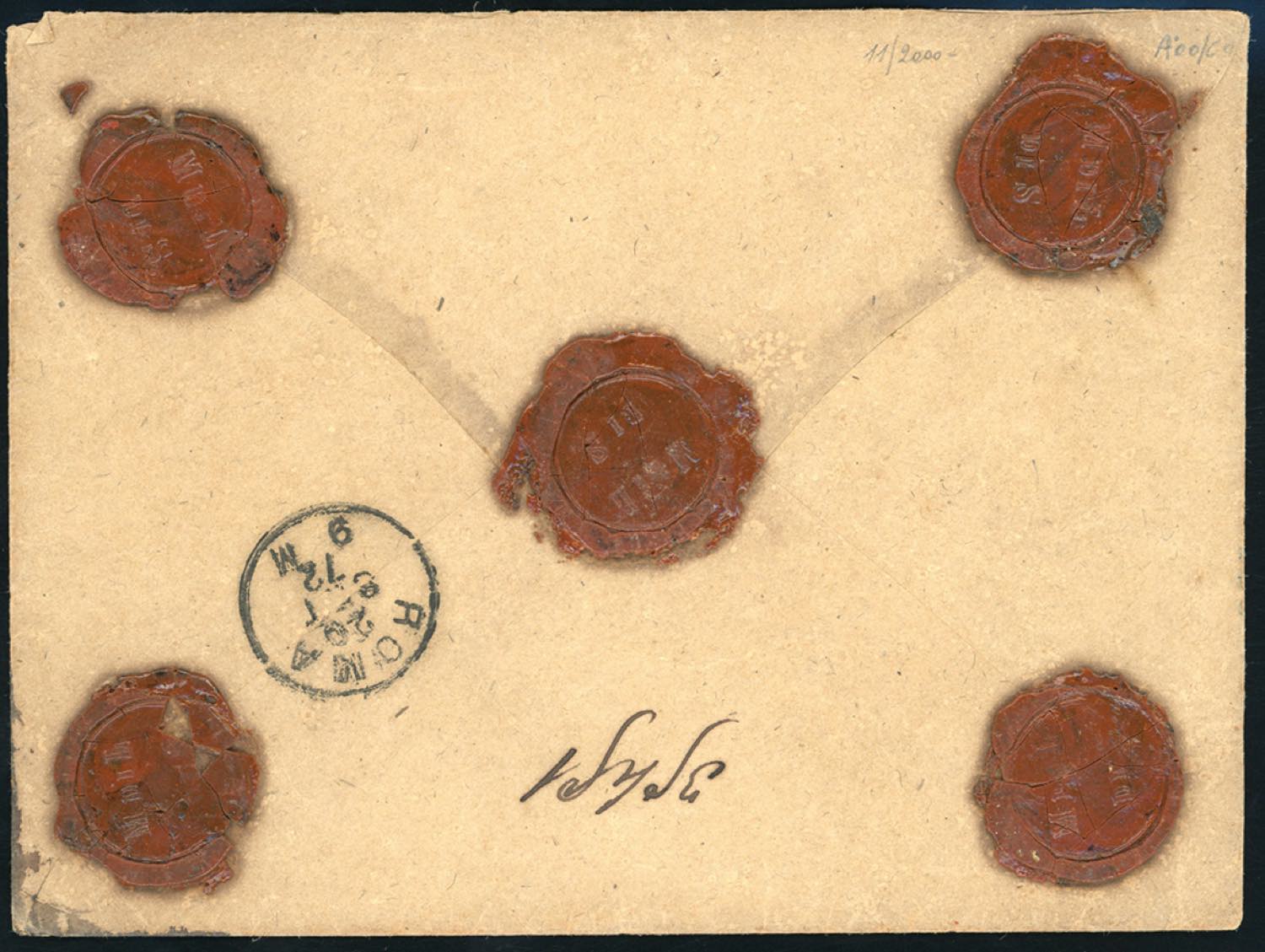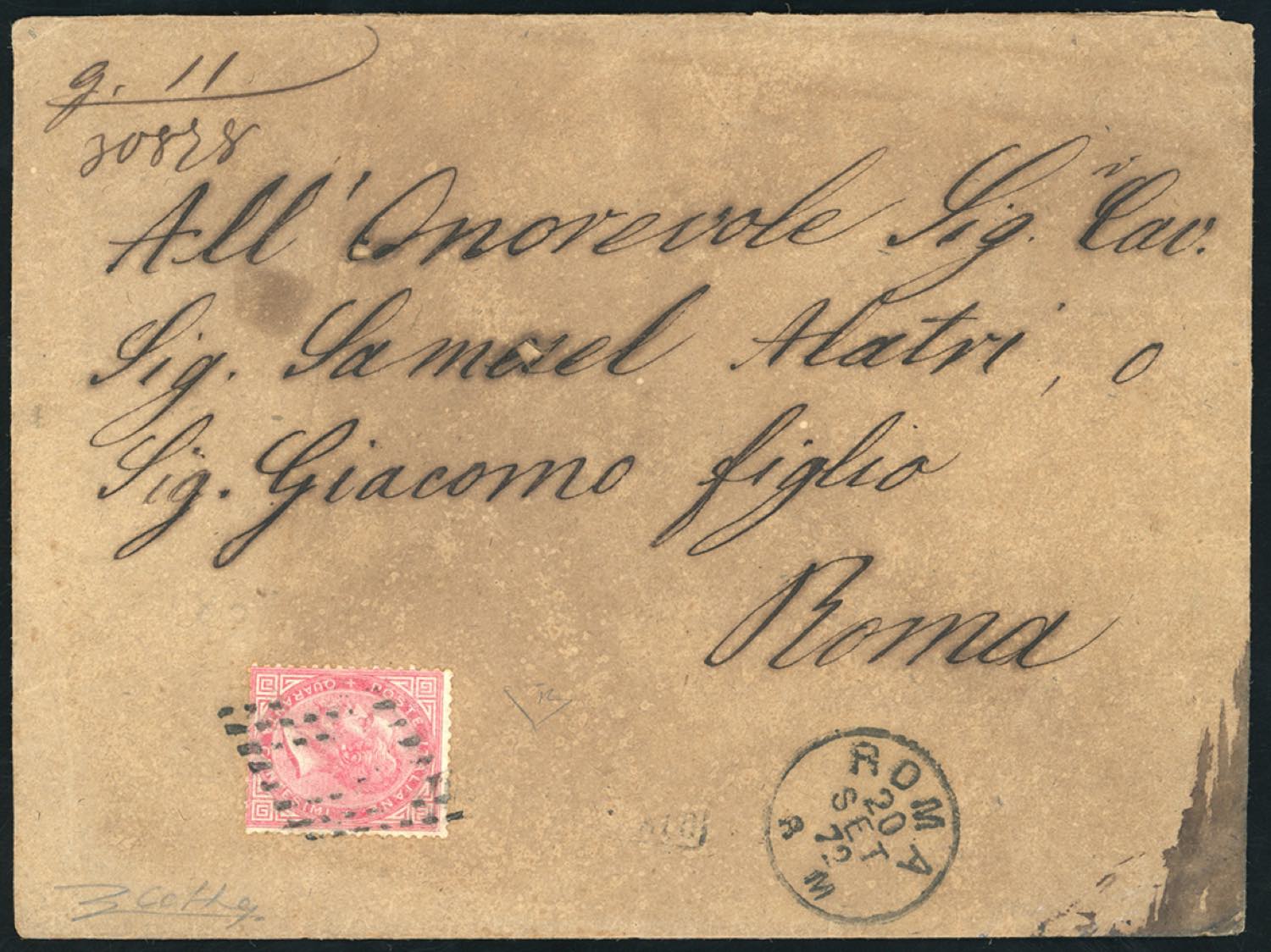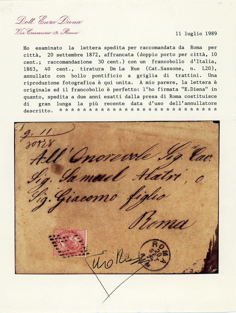1872 - 40 cent. De La Rue, tiratura di Torino (T20), perfetto, su busta raccomandata da Roma 20/9/1872 per città. Si tratta dell'ULTIMA DATA D'USO della griglia a trattini di fornitura ponitificia. Molto rara. Cert. E.Diena e Colla.