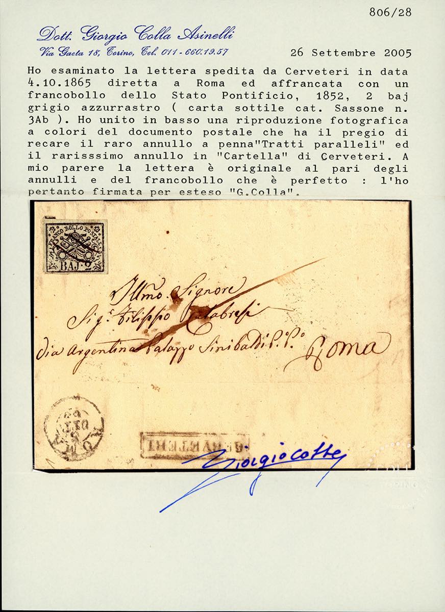 CERVETERI, punti R2 - 2 baj (3Ab), perfetto, su lettera del 4/10/1865 per Roma, francobollo annullato con tratti di penna. Molto raro e di ottima qualità. Cert. Colla.