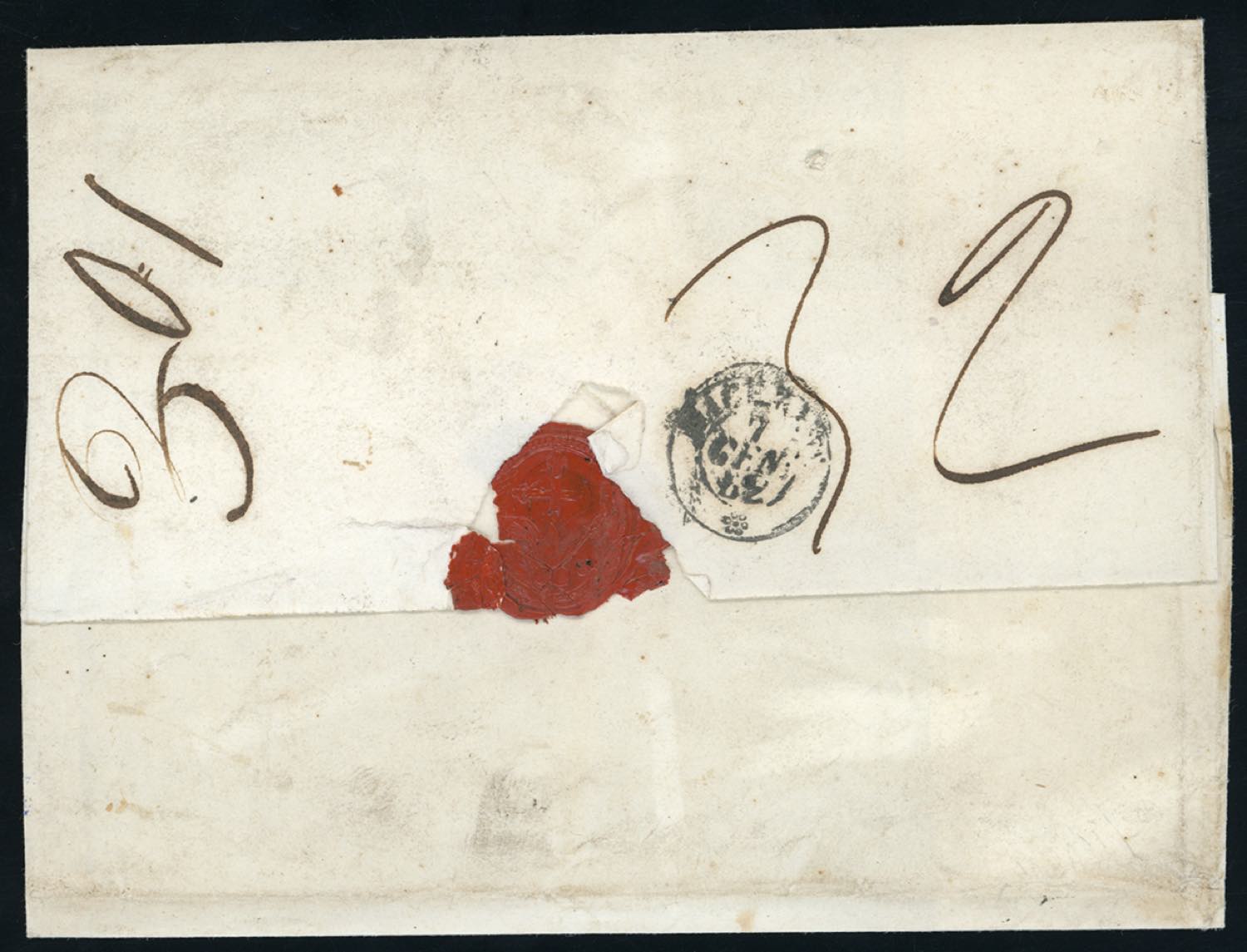 FERMO, SD punti R3 - 2 baj (3), coppia orizzontale, angolo di foglio, perfetta, su sovracoperta di lettera da Fermo 6/1/1852 a Loro. Estremamente rara e di ottima qualità. Cert. E.Diena e Colla. (cat. Sassone € 35.000/52.500).