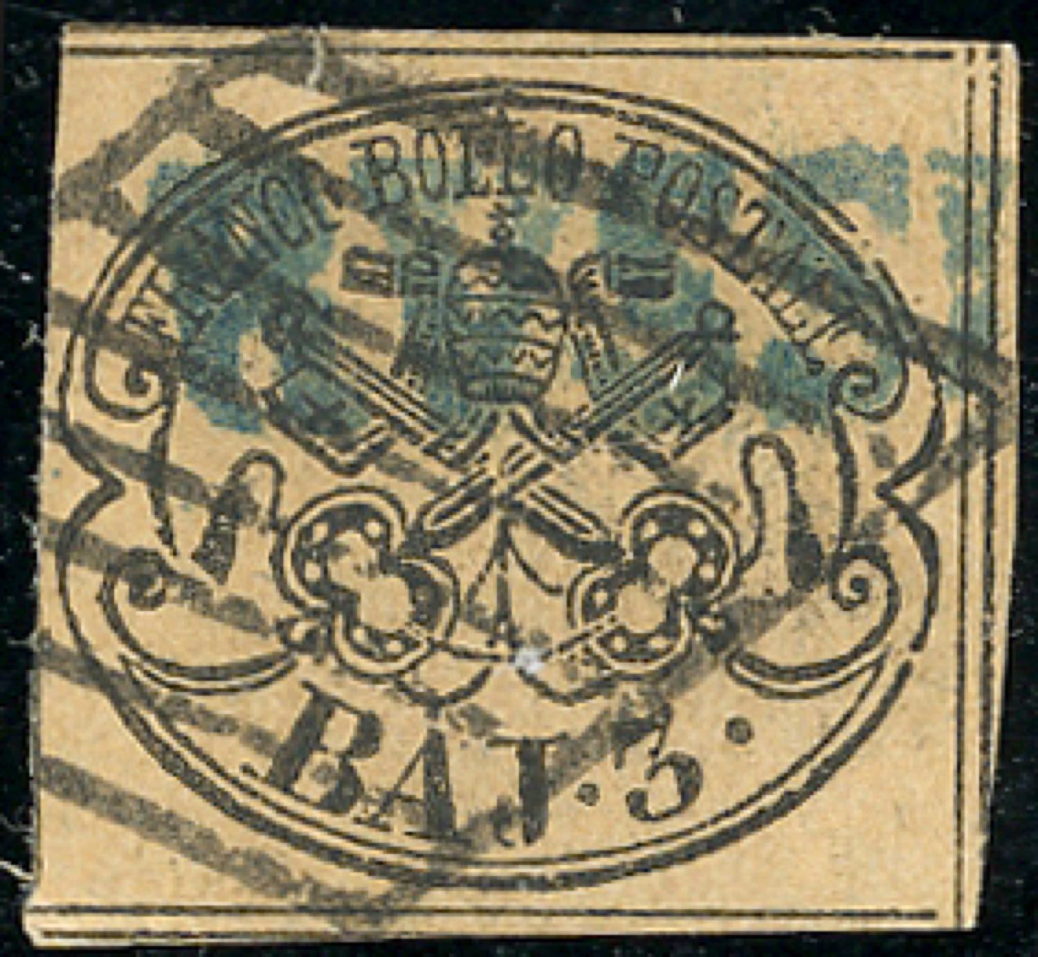 RUSSI, SD azzurro punti 12 - 3 baj (4), piccolo taglietto in alto, esterno al disegno, annullato con il lineare e la griglia. Raro annullo. Chiavarello. Ex coll. Imperato.