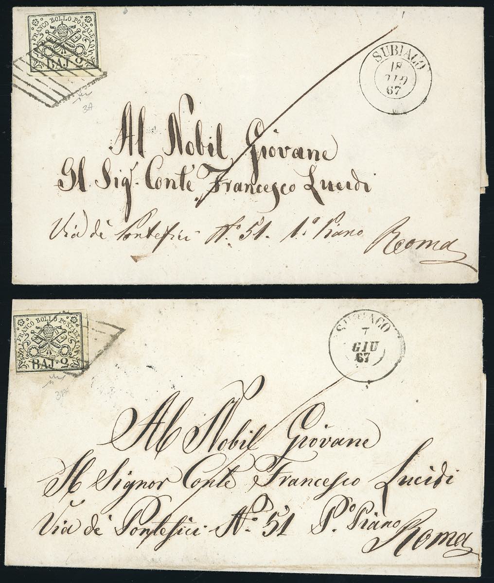 SUBIACO, 2C mese capovolto - 2 baj (3A), perfetto, su sovracoperta di lettera del 18/6/1867 - mostrante il mese del datario capovolto - per Roma. Allegata analoga lettera del 7/6/1867 con datario dritto. Chiavarello. Ex coll. Imperato.