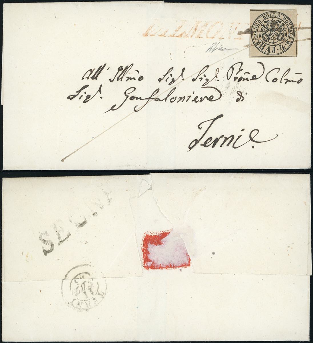 VALMONTONE, SI rosso + penna punti 12 - 4 baj (5), perfetto, su sovracoperta di lettera da Segni, lineare al verso, a Terni 11/9/1855. Rara e di ottima qualità. R.Diena.