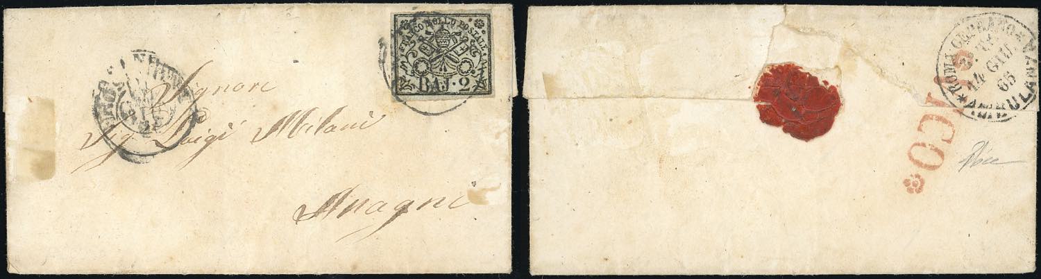 VICO, SD rosso punti R3 - 2 baj (3Ab), perfetto, su lettera per Anagni, bollo dell'ambulante Roma - Ceprano del 14/6/1865 al verso. Annullo rarissimo, uno dei pezzi chiave di questa collezione. Cert. R.Diena (cat. Sassone €35.000/52.500).