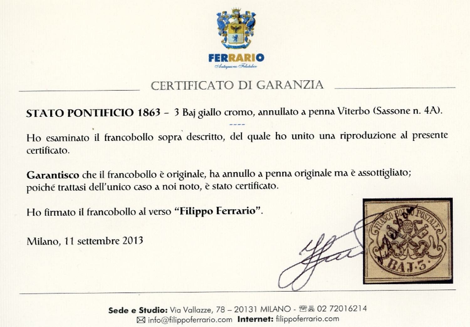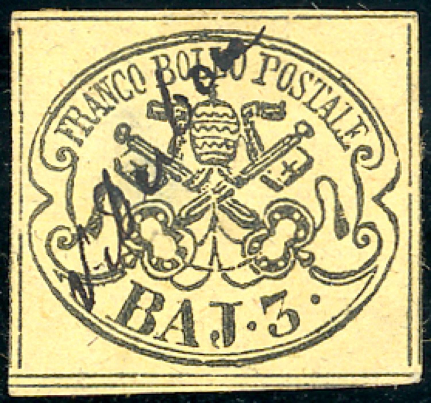 VITERBO, a penna - 3 baj giallo cromo (4A), assottigliato, annullato a penna con il nome della città. Unico caso noto! Cert. Ferrario.