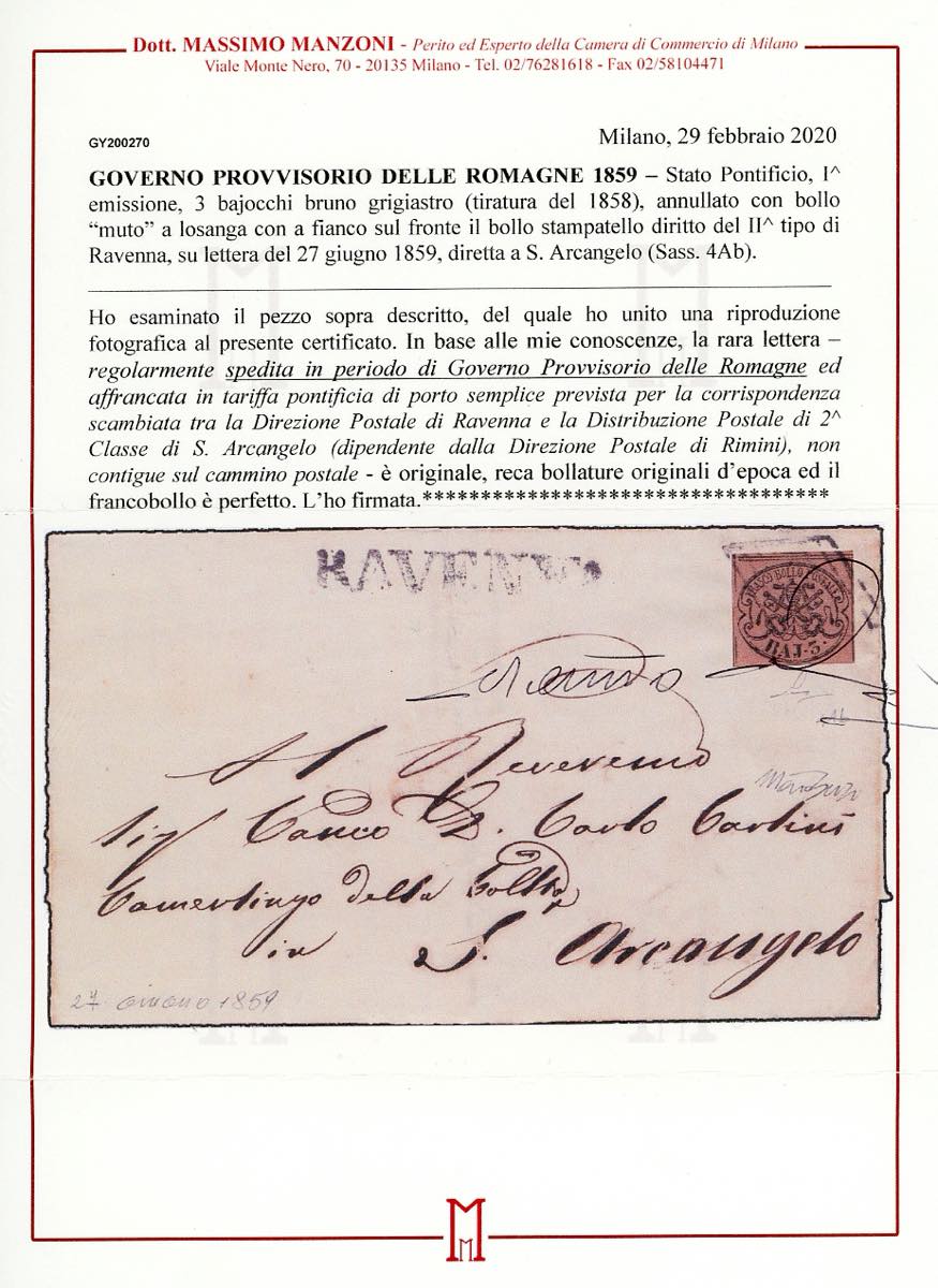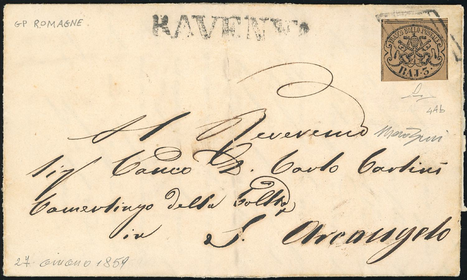 1859 - 3 baj bruno grigiastro (4Ab), perfetto, su lettera da Ravenna 27/6/1859 a Sant'Arcangelo. Cert. Manzoni.