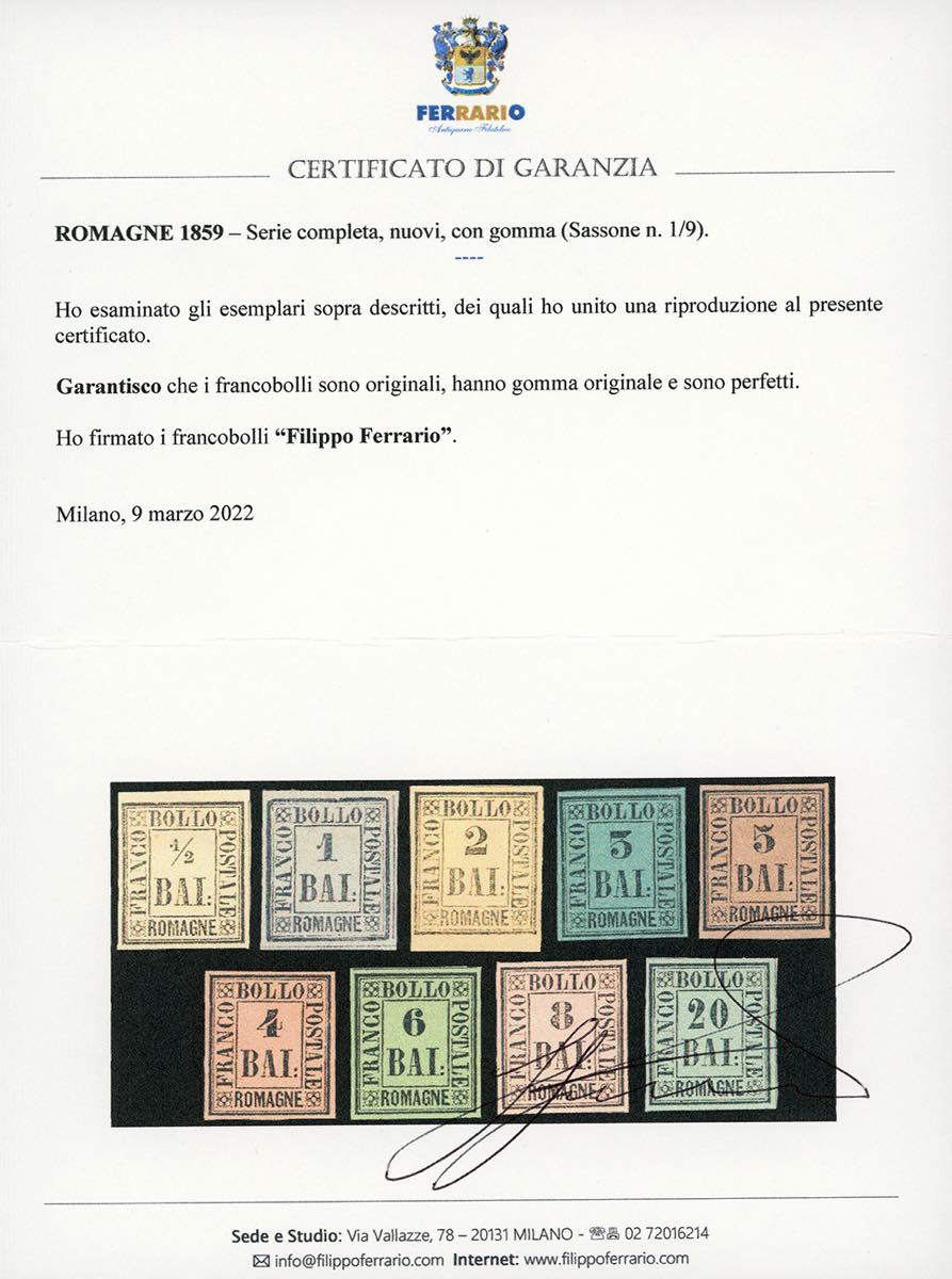 1859 - Serie completa (1/9), nuovi, gomma originale, perfetti, molto freschi. Alcuni valori firmati da noti periti. Cert. Ferrario.