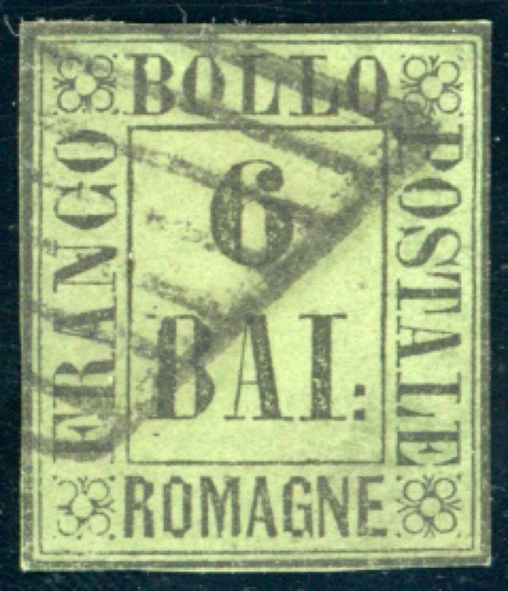 1859 - 6 baj verde giallo (7), ritagliato lungo i margini, usato. Raro, occasione. Em.Diena.