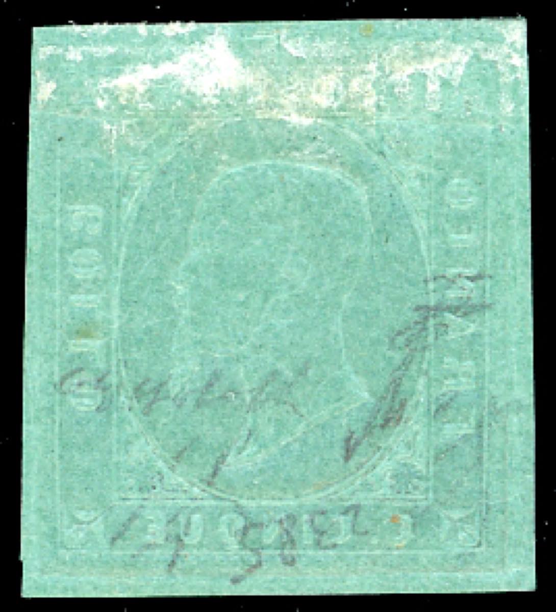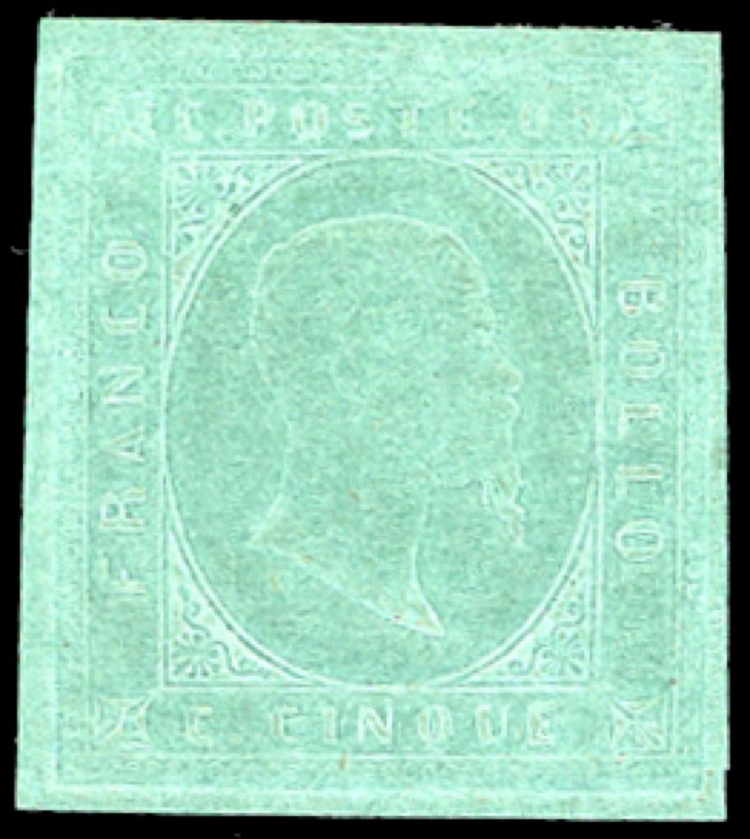 1853 - 5 cent. verde (4), perfetto e ben marginato, gomma originale, eccezionale freschezza. Molto bello e raro in queste condizioni. G.Bolaffi, A.Diena, cert. Avi e Ferrario.