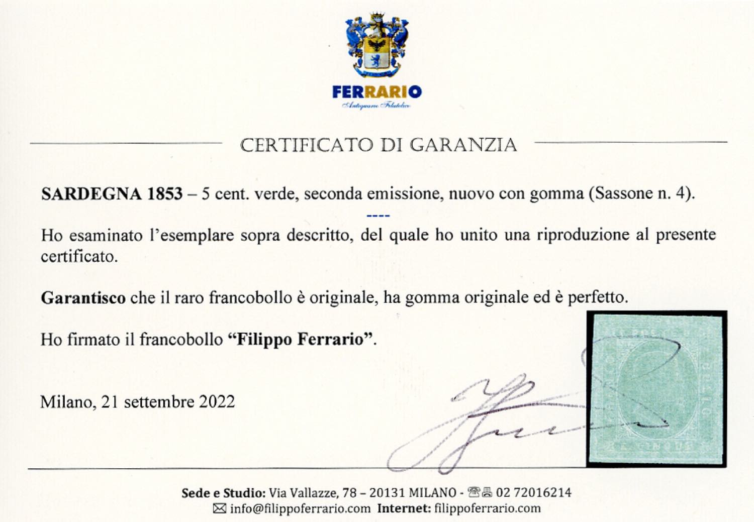 Lotto 542 - 1853 - 5 cent. verde (4), perfetto e ben marginato, gomma ...