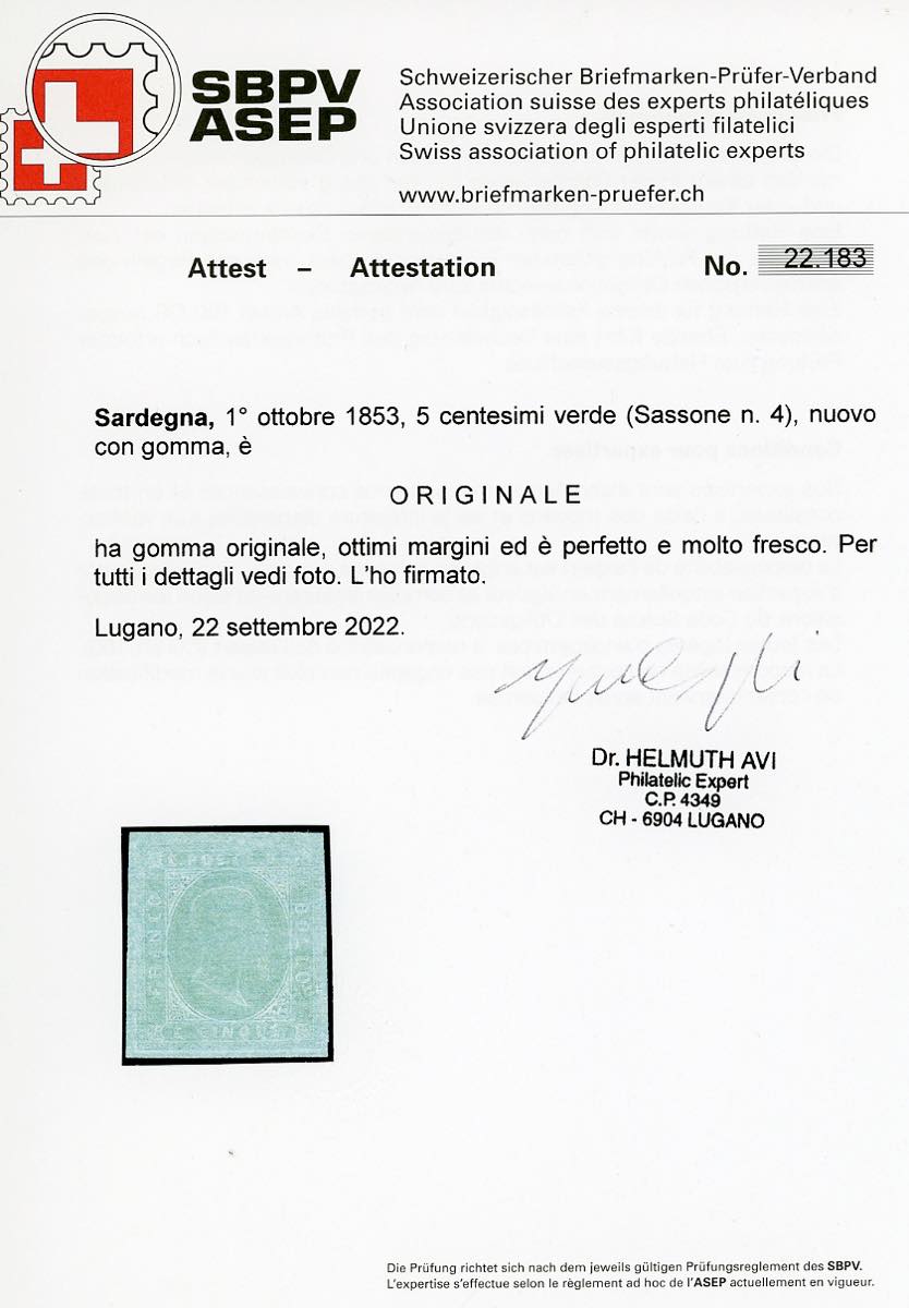 1853 - 5 cent. verde (4), perfetto e ben marginato, gomma originale, eccezionale freschezza. Molto bello e raro in queste condizioni. ... Leggi tutto