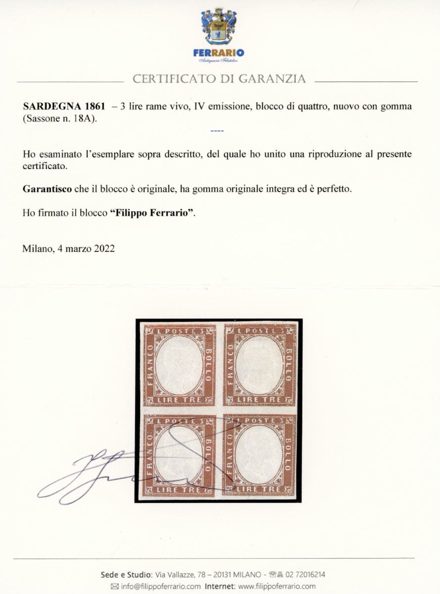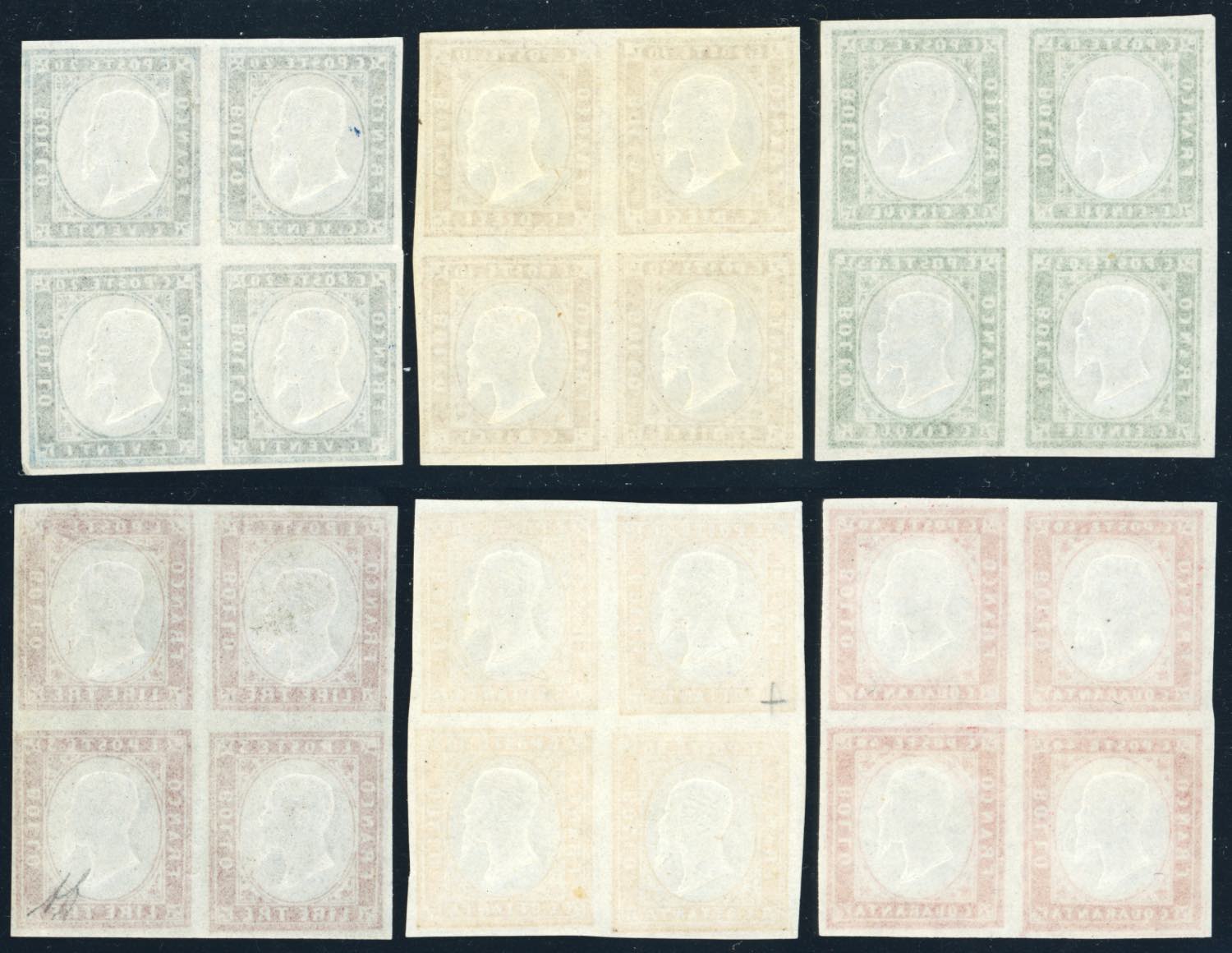 1863 - IV emissione, serie completa, tinte più comuni (13E/18A), blocchi di quattro, nuovi, gomma originale integra, perfetti. Molto ... Leggi tutto