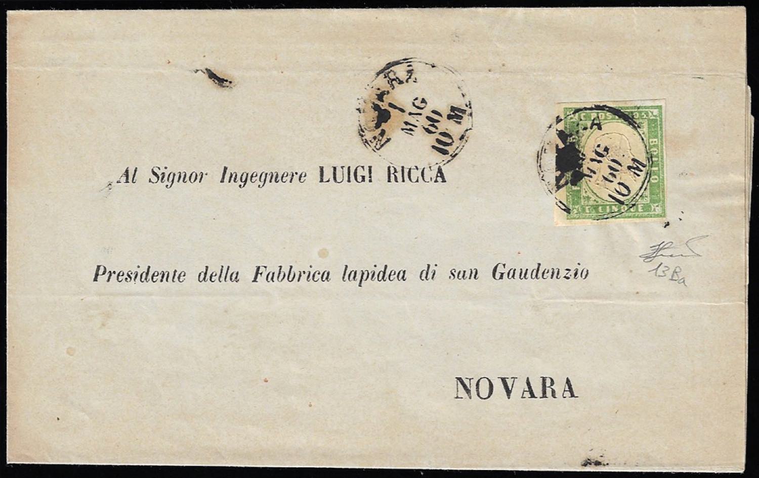 1860 - 5 cent. verde giallo (13Ba), perfetto, isolato su circolare da Novara 1/6/1860 per città. Ferrario.