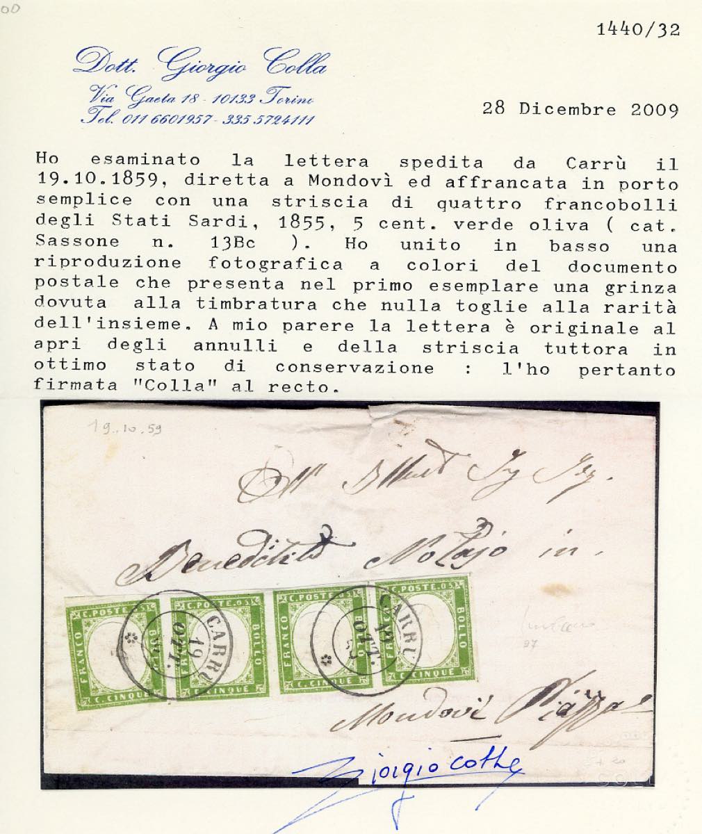 1859 - 5 cent. verde oliva (13Bc), striscia orizzontale di quattro, ottimo stato, su sovracoperta di lettera da Carrù 19/10/1859 (punti 6) a Mondovì. Rara e molto fresca. Cert. Colla, Ex coll. Hess.