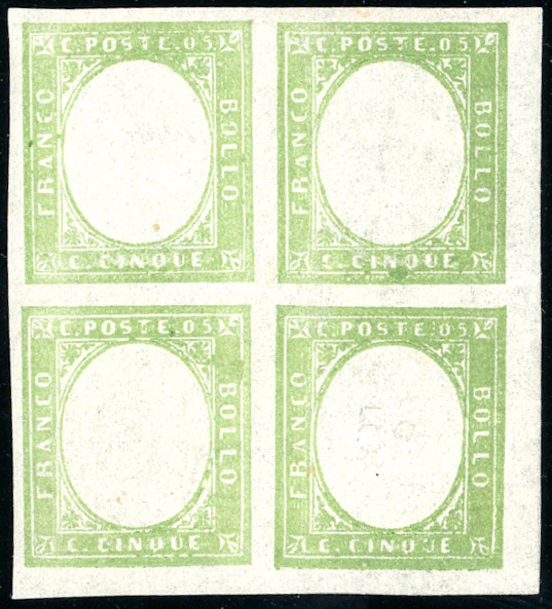 1863 - 5 cent. verde chiaro smorto, senza effigie (13Eb), blocco di quattro, gomma originale, integra per tre esemplari, perfetto. Molto ... Leggi tutto