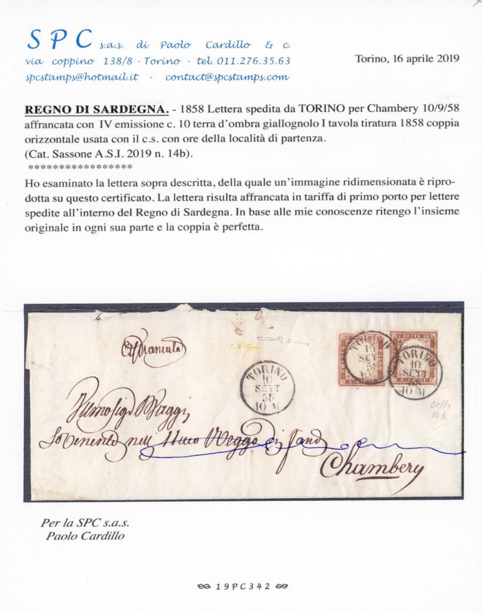 1858 - 10 cent. terra d'ombra giallognolo (14b), coppia, perfetta, su lettera da Torino 10/9/1858 a Chambery, indirizzata ad un militare. Colla, cert. Cardillo.