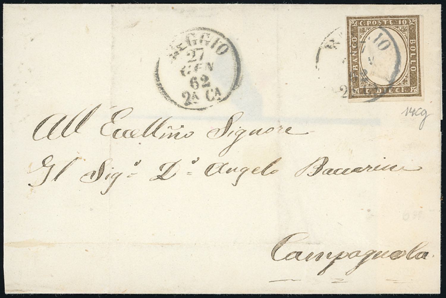 1862 - 10 cent. bruno grigio olivastro (14Cg), ottimo stato, su sovracoperta di lettera, senza lembi laterali, da Reggio 27/1/1862 a Campagnola. Interessante tariffa "limitrofa" tra località distanti fino a 20 km in periodo di Regie Province dell'Emilia.