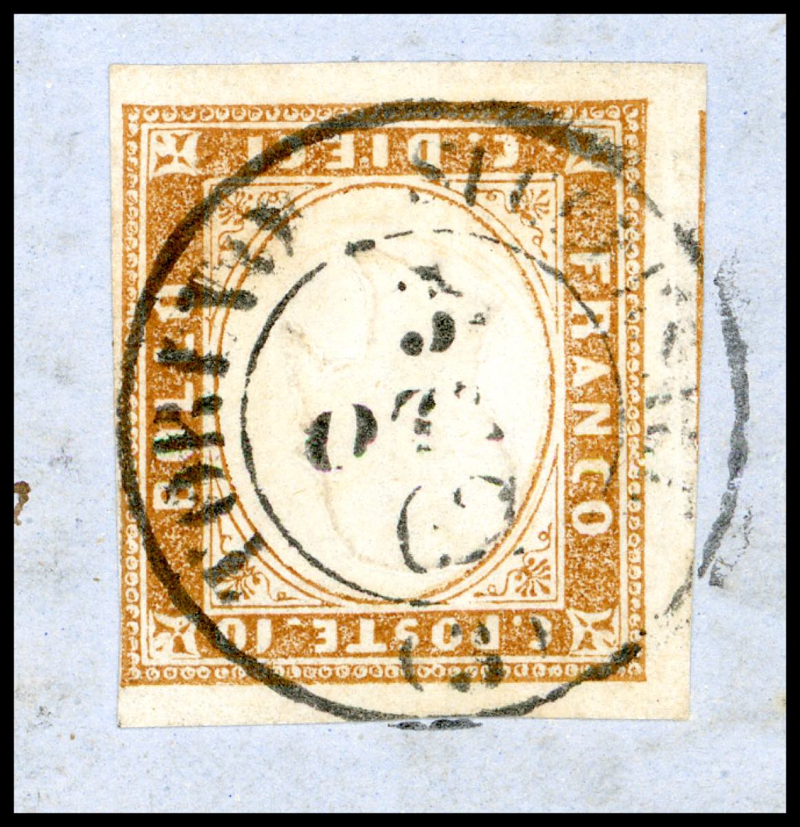 1862 - 10 cent. bruno rossastro (14Cn), tre ottimi margini, giusto a destra, isolato su circolare a stampa da Torino 3/10/1862 per città. Raro insieme. Colla. Ex coll. Hess.