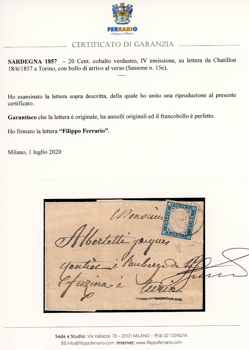 1857 - 20 cent. cobalto verdastro (15e), perfetto, su lettera da Chatillon 18/6/1857 a Torino. Chiavarello, cert. Ferrario.