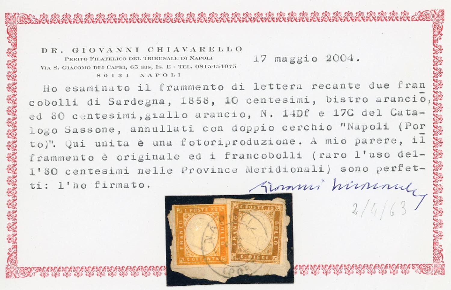 1861 - 80 cent. giallo arancio (17C), un esemplare usato su frammento a Palermo 14/2/1863, un altro usato insieme a un 10 cent. bistro arancio (14Df) su frammento a Napoli 2/2/1863. Non comune uso di questo valore nelle Province Meridionali. Cert. Chiavarello per il secondo. Ex coll. Imperato.