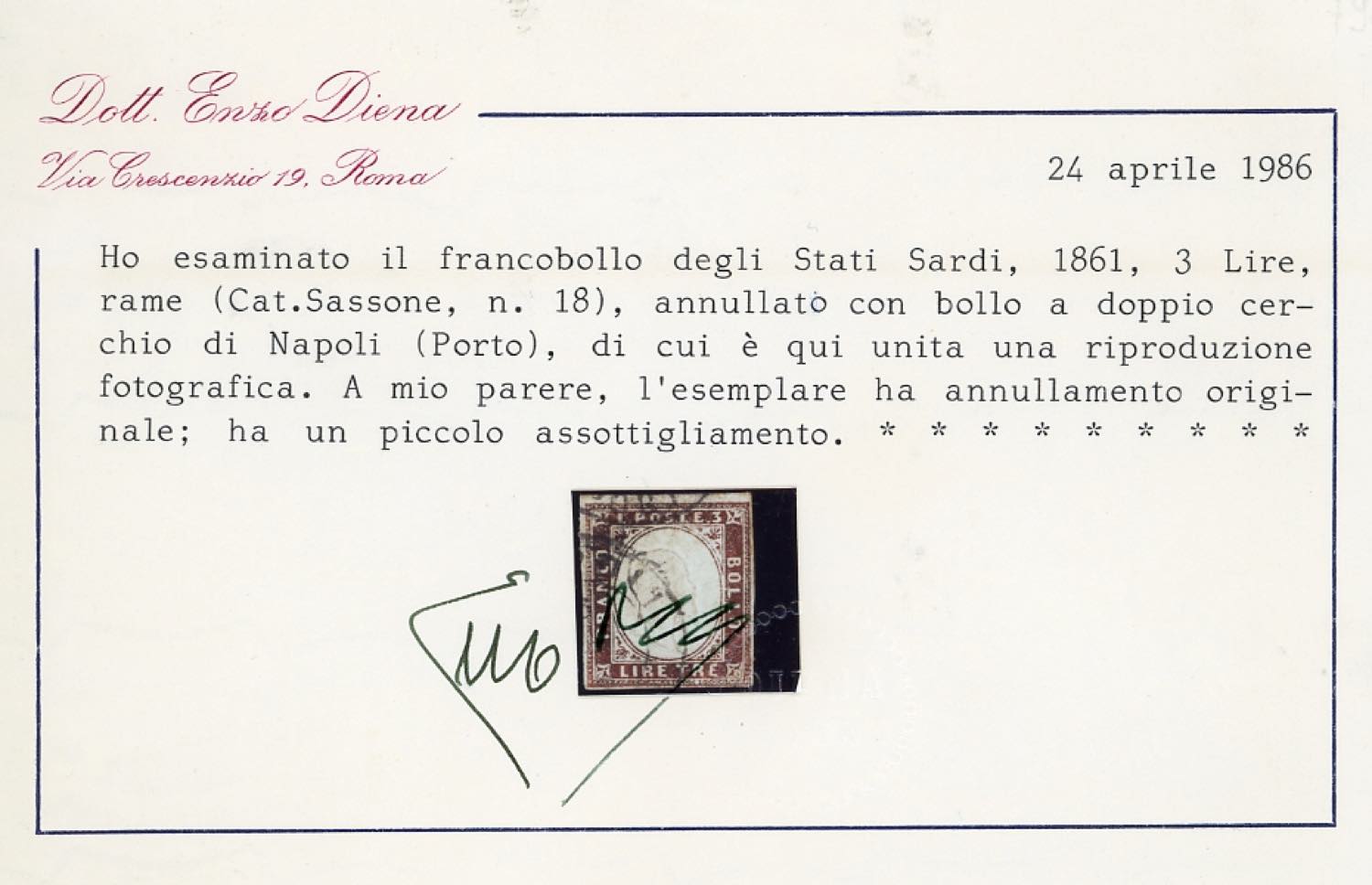 1861 - 3 lire rame (18), margini completi, piccolo assottigliamento al verso, usato a Napoli. A.Diena, cert. E.Diena. Ex coll. Imperato.