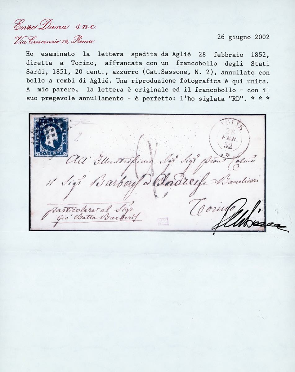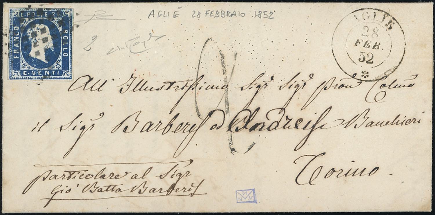 AGLIE', punti R1 - 20 cent. (2), perfetto, su lettera del 28/2/1852 per Torino, tassata. Molto rara! Raybaudi, cert. Diena.