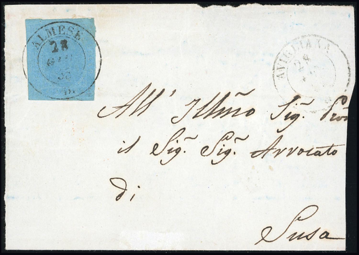 PIEMONTE-ALMESE, punti R2 - 20 cent. (5), leggermente corto a destra, su gran parte di fresca sovracoperta di lettera, incompleta a destra, del 28/6/1855 a Susa, bollo di arrivo al verso. Di questa emissione era finora noto solo un esemplare usato, segnalato dal cat. Sassone. Rarità degli annullamenti di Sardegna.