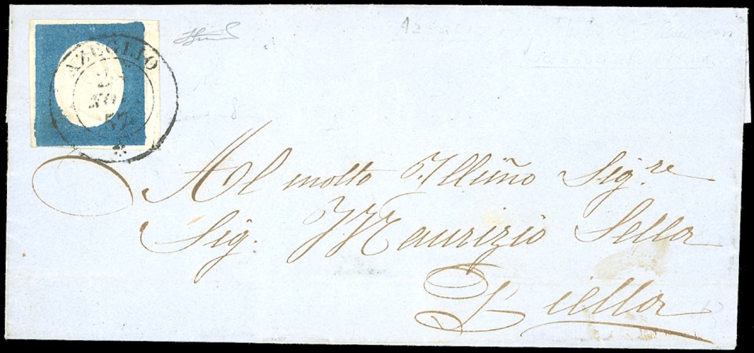 PIEMONTE-AZEGLIO, punti 10 - 20 cent. (8), bordo di foglio, perfetto, su sovracoperta di lettera del 28/11/1857 per Biella. Bella. Ferrario.