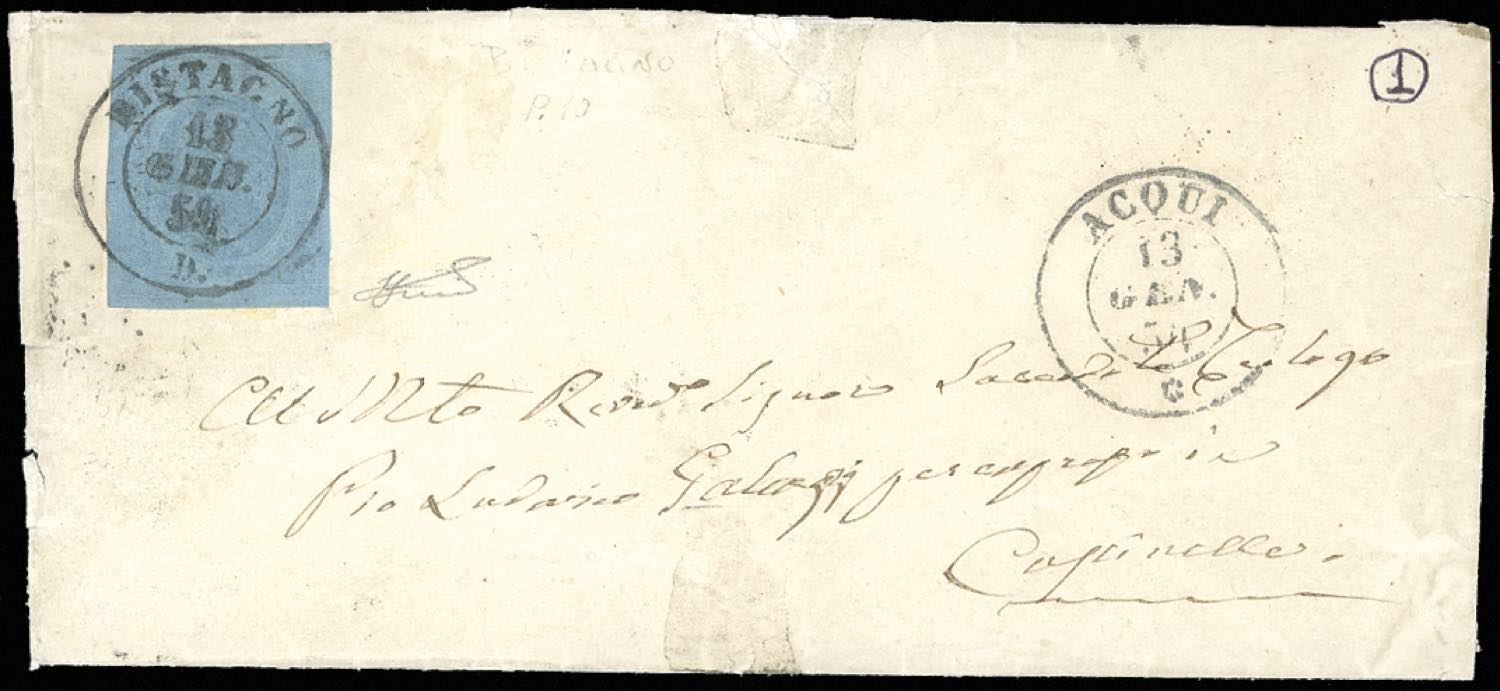 PIEMONTE-BISTAGNO, punti 10 - 20 cent. (5), perfetto, su sovracoperta di lettera del 13/1/1854 per Capannelle. Non comune. Ferrario.