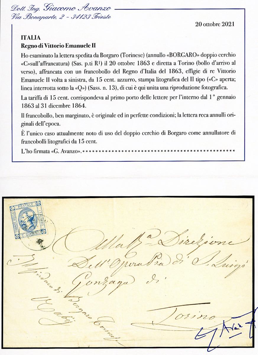 PIEMONTE-BORGARO, punti R1 - 15 cent. (13), perfetto, su sovracoperta di lettera del 20/10/1863 per Torino. UNICO CASO NOTO di questo raro annullo sul 15 cent. Litografico, ad oggi inedito e di prossima catalogazione. Ferrario, cert. Avanzo.