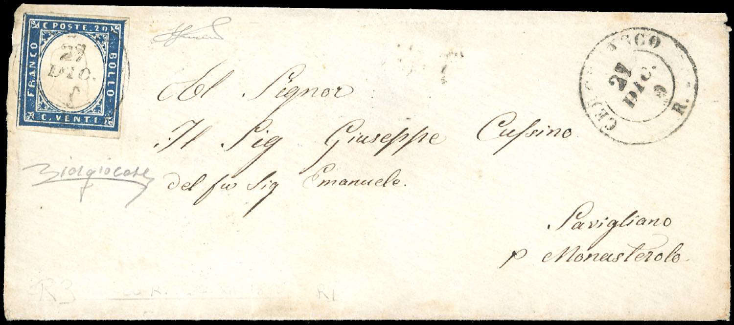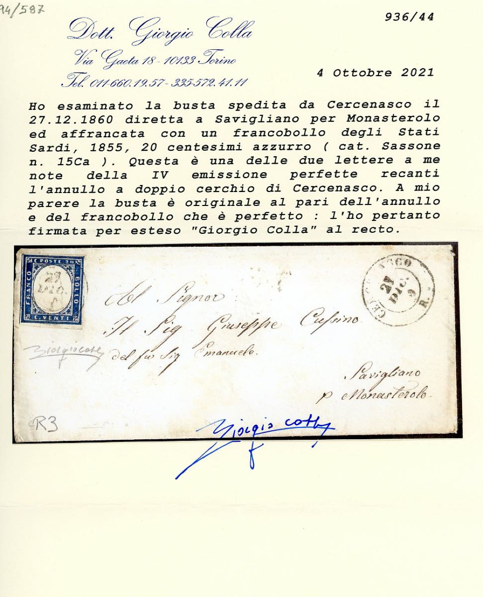 PIEMONTE-CERCENASCO, punti R3 - 20 cent. (15Ca), perfetto, su busta del 27/12/1860 a Monasterolo. UNA DELLE DUE LETTERE NOTE con francobolli perfetti della IV emissione. Rarità degli annullamenti di Sardegna. Ferrario, cert. Colla. (cat. Sassone € 35.000/52.500).
