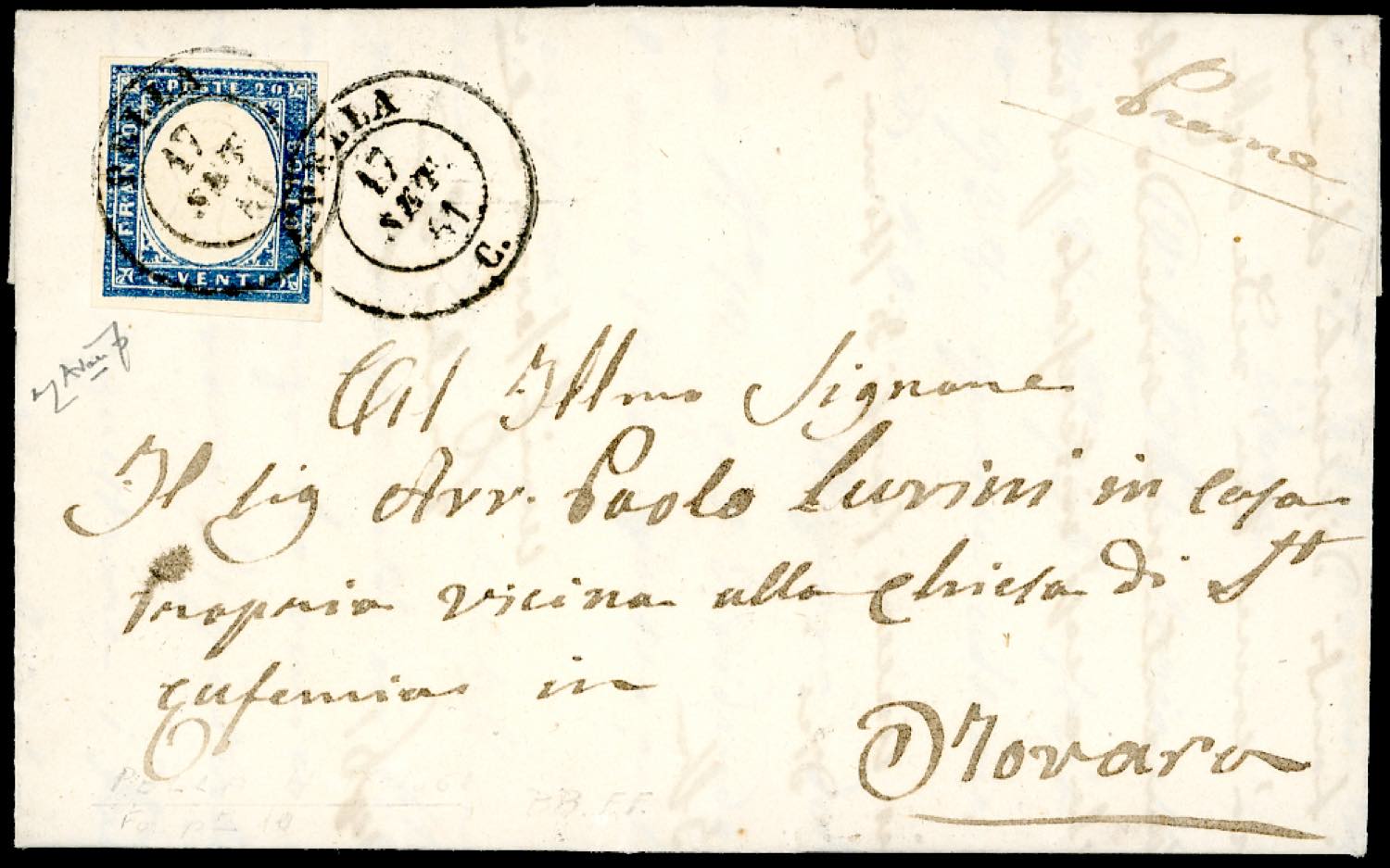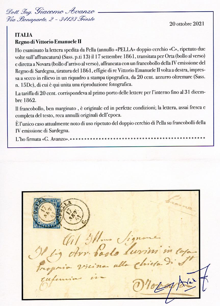 PIEMONTE-PELLA, d.c. ripetuto due volte sull'affrancatura, punti 13 - 20 cent. (15 Dc), perfetto e ben marginato, su lettera del 17/9/1861 per Novara. Tipologia di annulli di prossima catalogazione, attualmente UNICA NOTA. Ottima qualità. Cert. Colla.