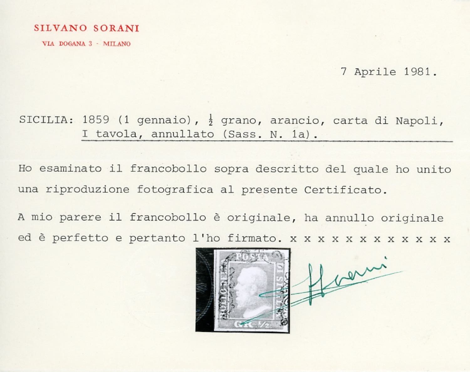 1859 - 1/2 grano arancio, I tavola, carta di Napoli (1a), usato, perfetto. Splendido, qualità lusso! Cert. Sorani.