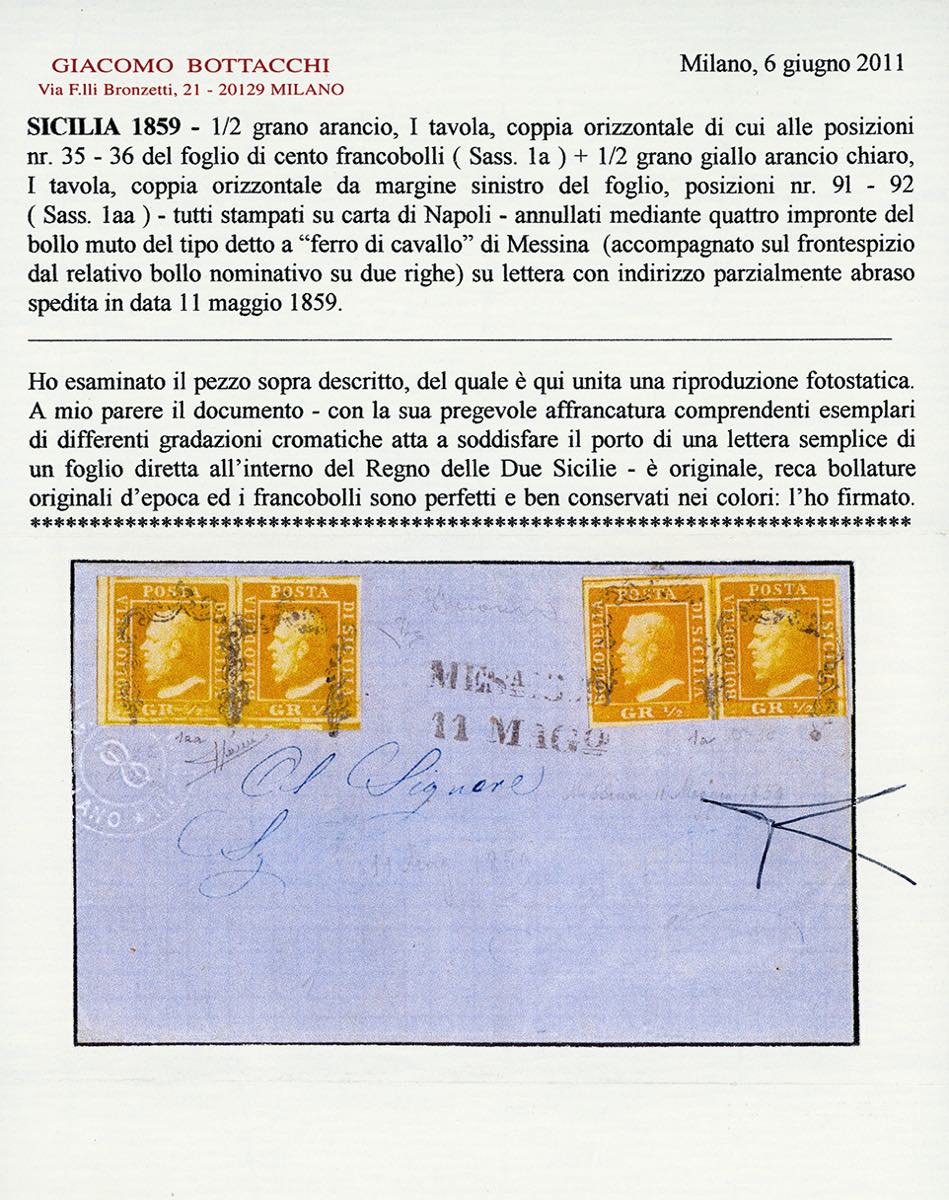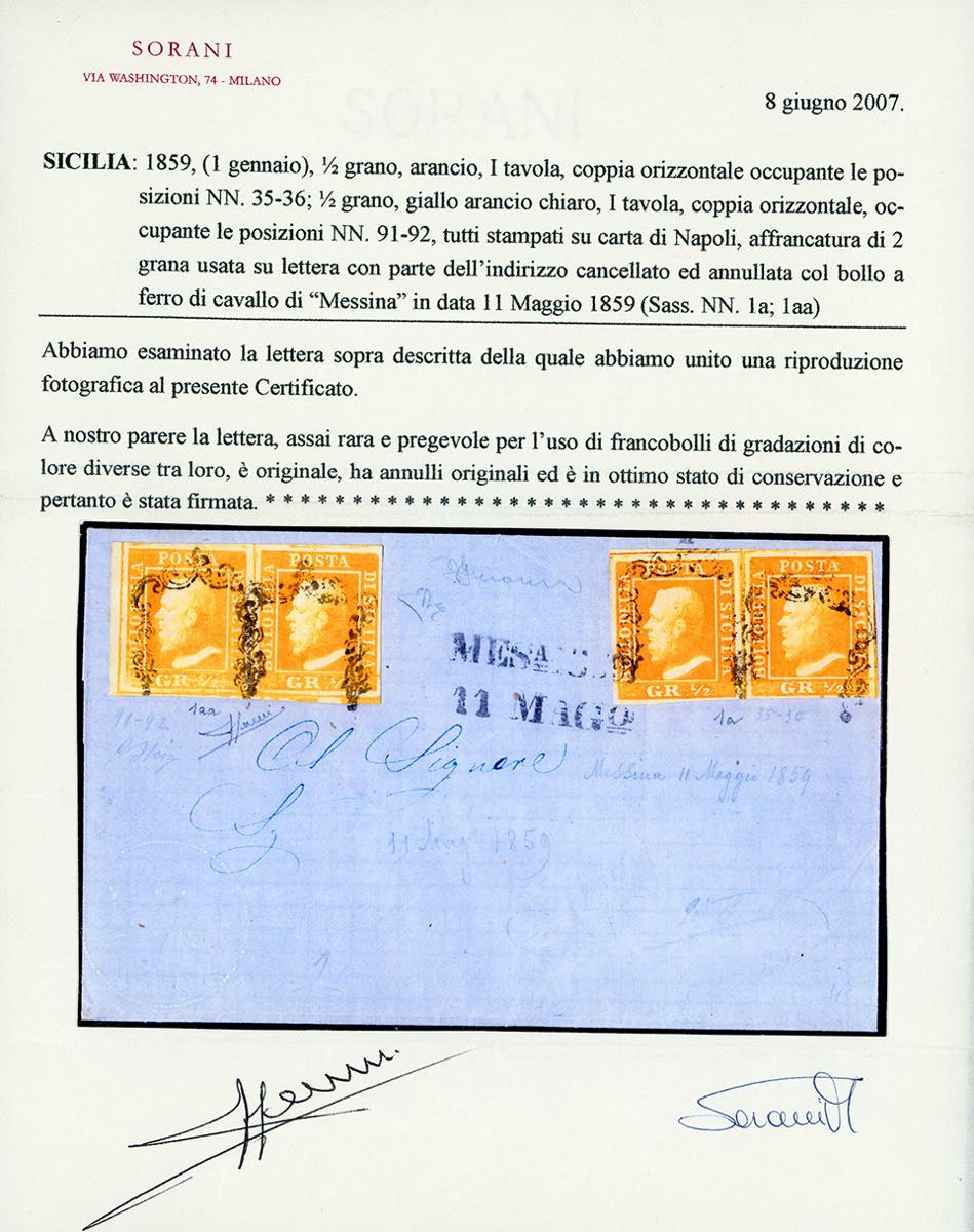 1859 - 1/2 grano arancio, I tavola, coppia orizzontale, pos. 35-36, 1/2 grano giallo arancio chiaro, I tavola, coppia orizzontale, pos. 91-92, bordo di foglio, entrambe carta di Napoli (1a,1aa), perfette e ben marginate, su fresca sovracoperta di lettera, da Messina 11/5/1859. Qualità eccezionale, da esposizione! Grioni, G.Oliva, E.Diena, cert. Bottacchi e Sorani.
