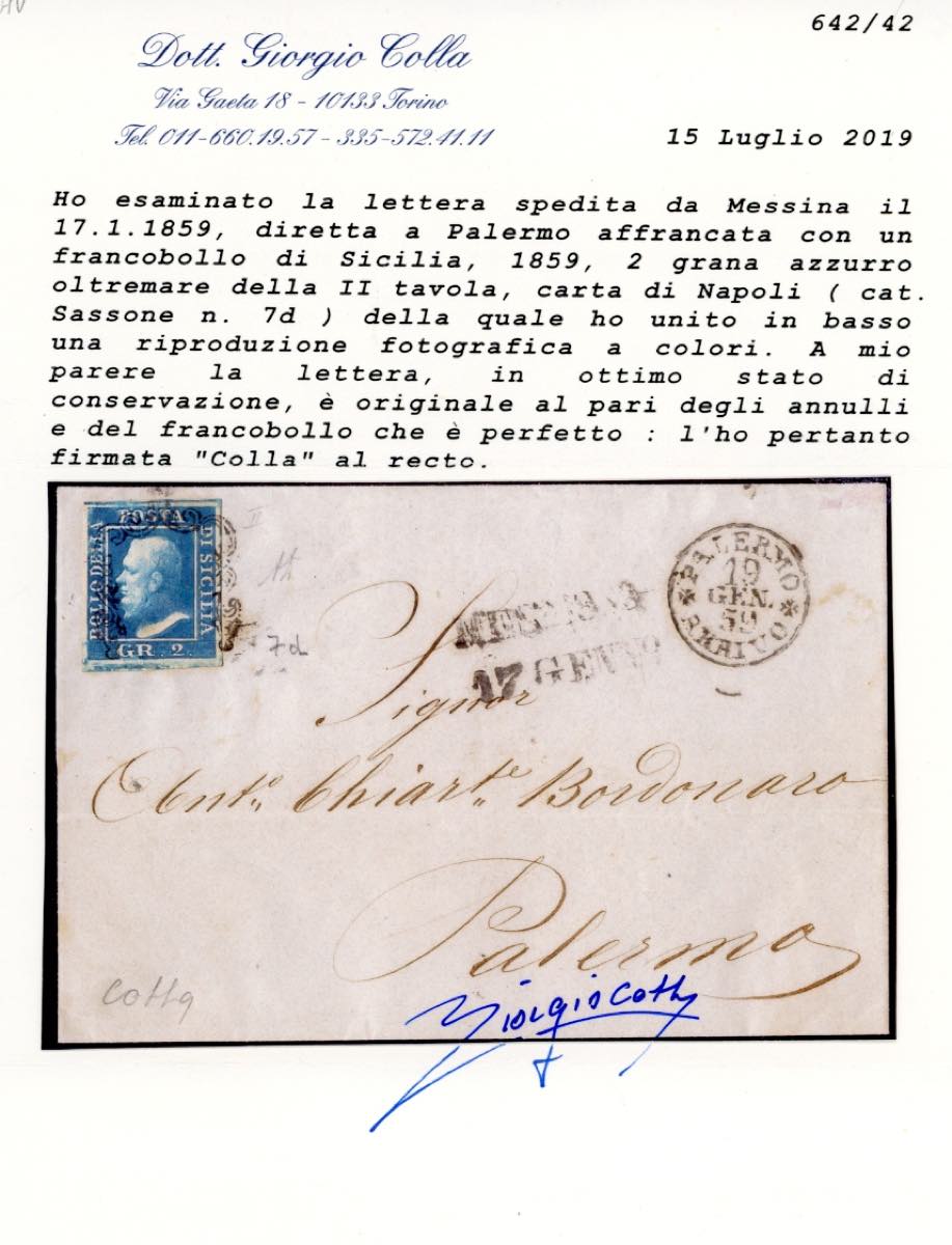 1859 - 2 grana azzurro oltremare, II tavola (7d), perfetto, su sovracoperta di lettera da Messina 17/1/1859 a Palermo. Bella. A.Diena, cert. Colla.