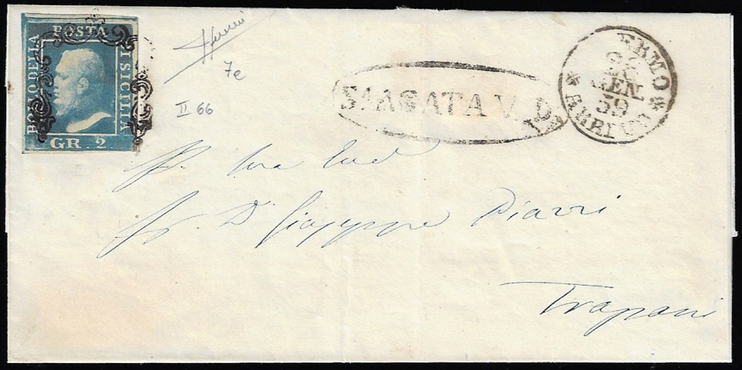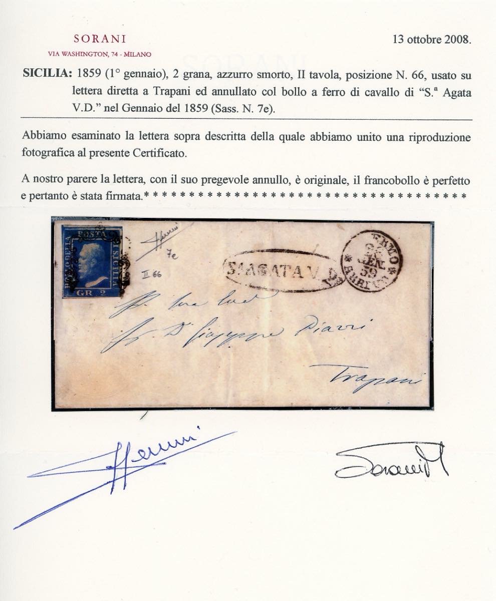1859 - 2 grana azzurro smorto, II tavola, pos. 66 (7e), perfetto, su sovracoperta di lettera da Sant'Agata V.D. (punti 8) a Trapani, transito a Palermo 28/1/1859. Splendida e rara! Cert. Sorani.