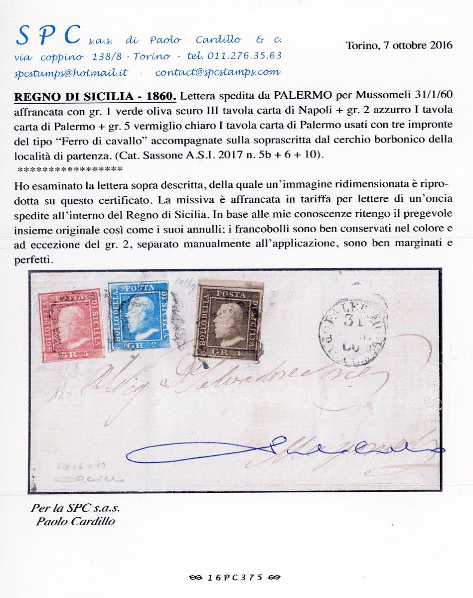 1860 - 5 grana vermiglio chiaro, I tavola (10), perfetto, con 1 grano e 2 grana (5a,6g), perfetto il primo, corto a destra il secondo, su fresca lettera da Palermo 31/1/1860 a Mussumeli. Molto raro l'uso postale del n. 10. Emilio e A.Diena, cert. Cardillo e Colla.