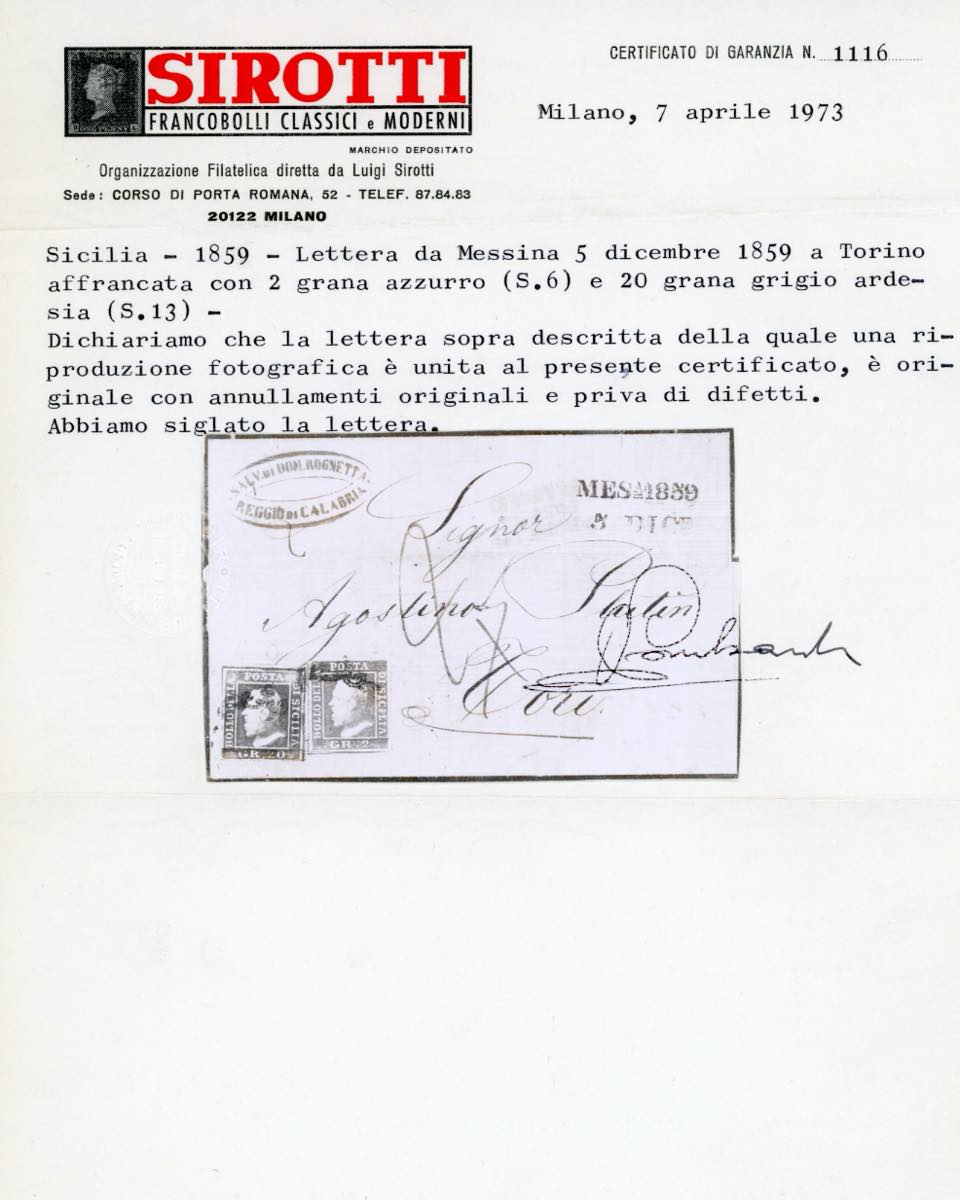1859 - 20 grana grigio ardesia, 2 grana azzurro, I tavola (13,6), perfetti, su sovracoperta di lettera, parzialmente incompleta, da Messina 5/12/1859 a Torino, con i Piroscafi postali francesi, tassata. A.Diena, cert. Sirotti.