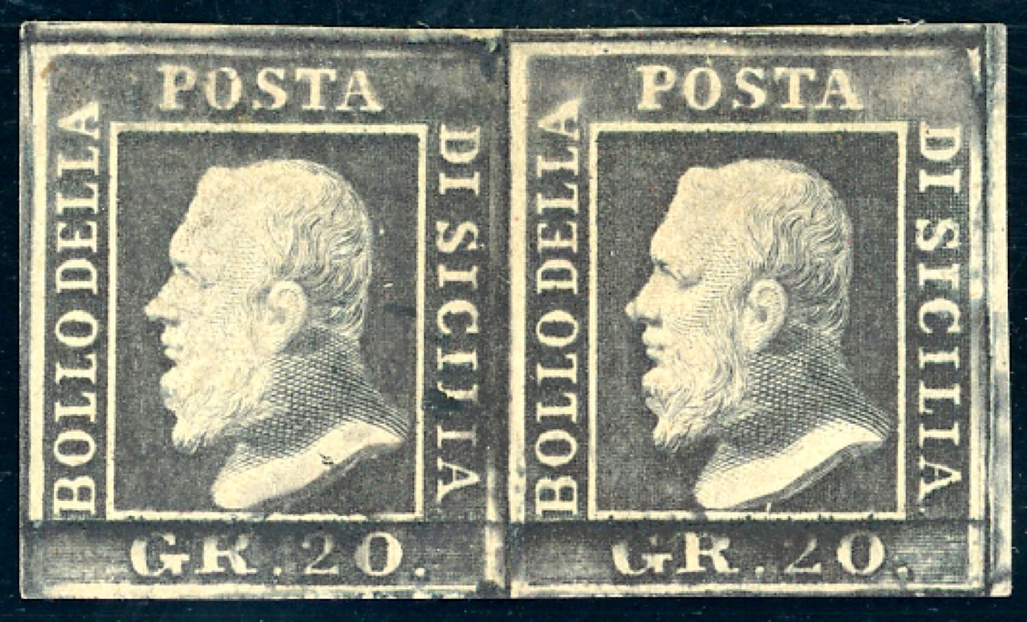 1859 - 20 grana violetto ardesia scuro (13b), coppia orizzontale, posiz. 49-50 della tavola, nuova, gomma originale, lieve traccia di linguella, perfetta. Bellissima e rara! Emilio e Alberto Diena, cert. Enzo Diena.