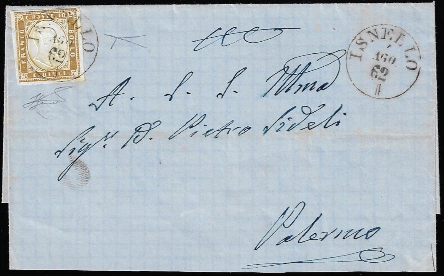 ISNELLO, punti R1 - 10 cent. bruno olivastro (14Cl), perfetto, isolato su fresca lettera del 4/8/1862 per Palermo. Bella e rara! Ferrario. Cert. Bottacchi.