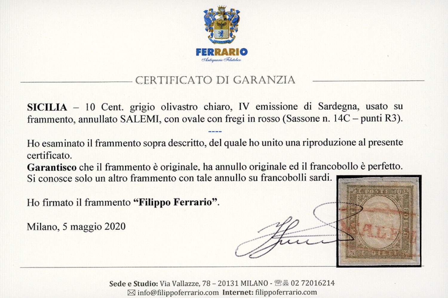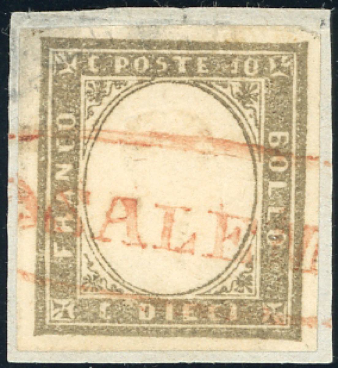 SALEMI, ovale con fregi rosso, non quotato - 10 cent. (14C), perfetto, usato su frammento. Non si conoscono lettere con francobolli di Sardegna con tale annullatore, ma solo un frammento analogo. Rarità da stimarsi pari ad un R3. Cert. Ferrario, ex collez. Nino Aquila.