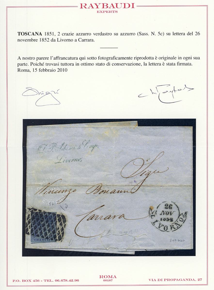 1852 - 2 crazie azzurro verdastro su azzurro (5c), perfetto, su sovracoperta di lettera da Livorno 26/11/1852 a Carrara. E.Diena, cert. Raybaudi.
