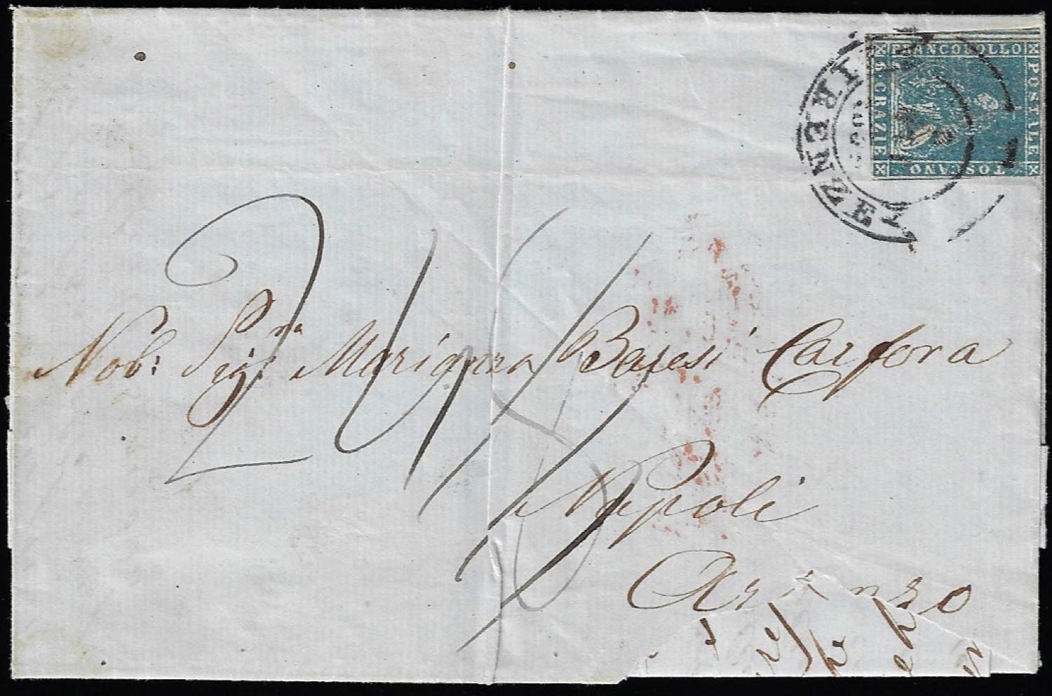 1859 - 6 crazie azzurro (15), margini leggermente intaccati, su lettera da Firenze 5/10/1859 ad Arienzo, tassa 8 cassata e corretta in 24, bollo di transito per lo Stato Pontificio al verso. Interessante.