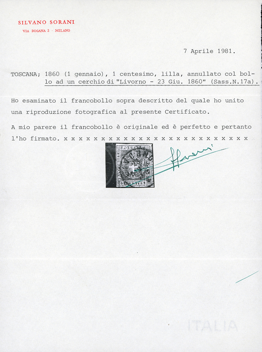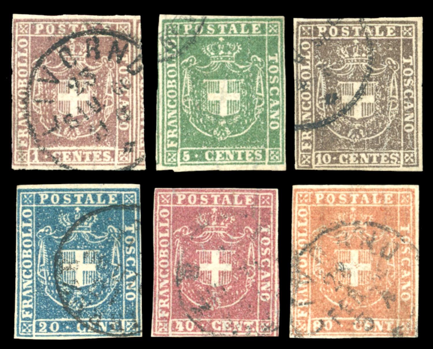1860 - Serietta di sei valori (17/23), usati, perfetti. Ferrario, cert. Sorani per l'80 cent.