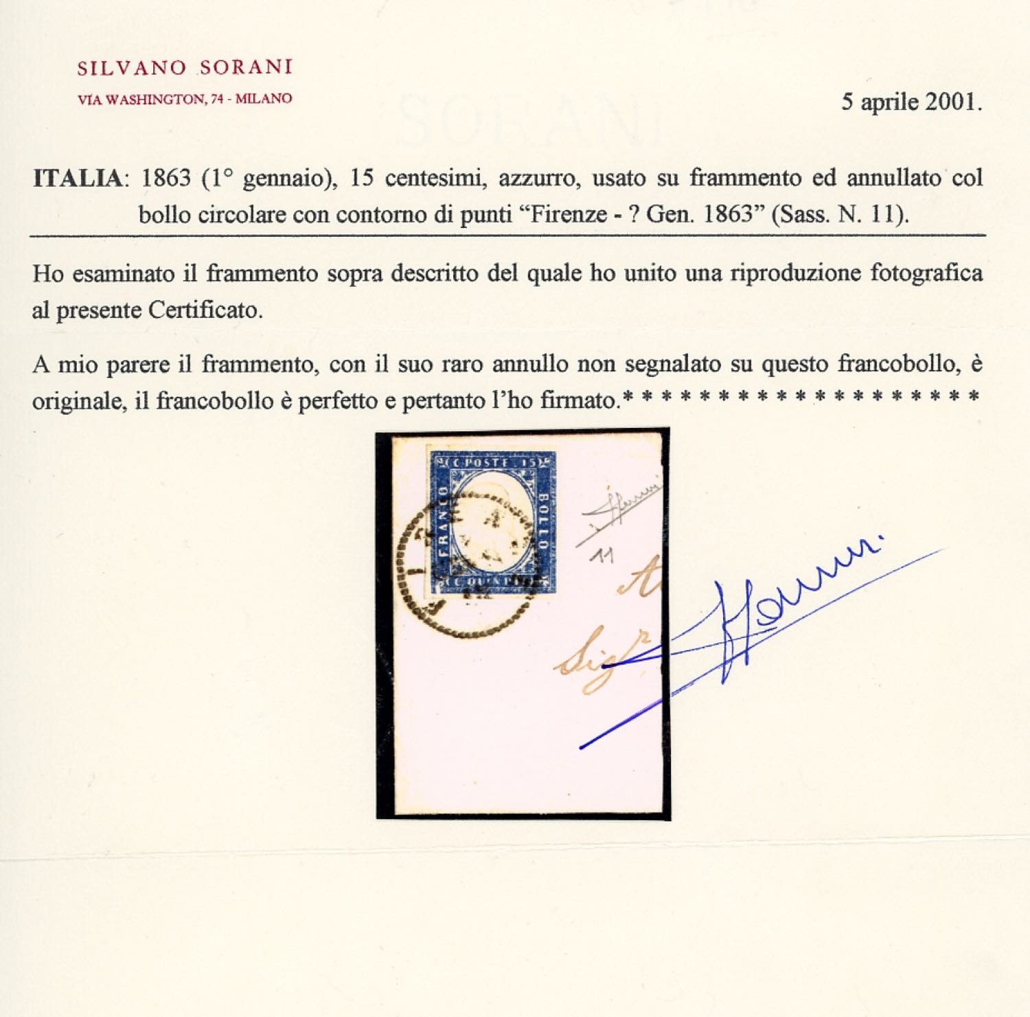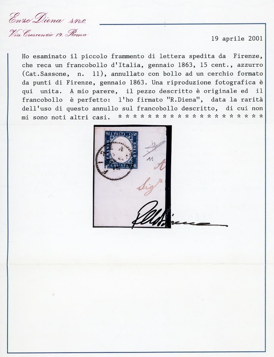 FIRENZE, cerchio formato da punti - 15 cent. tipo Sardegna (11), perfetto, usato su frammento con il bollo datario a cerchio formato da puntini del gennaio 1863. Inedito su questo francobollo! Cert. Diena e Sorani.