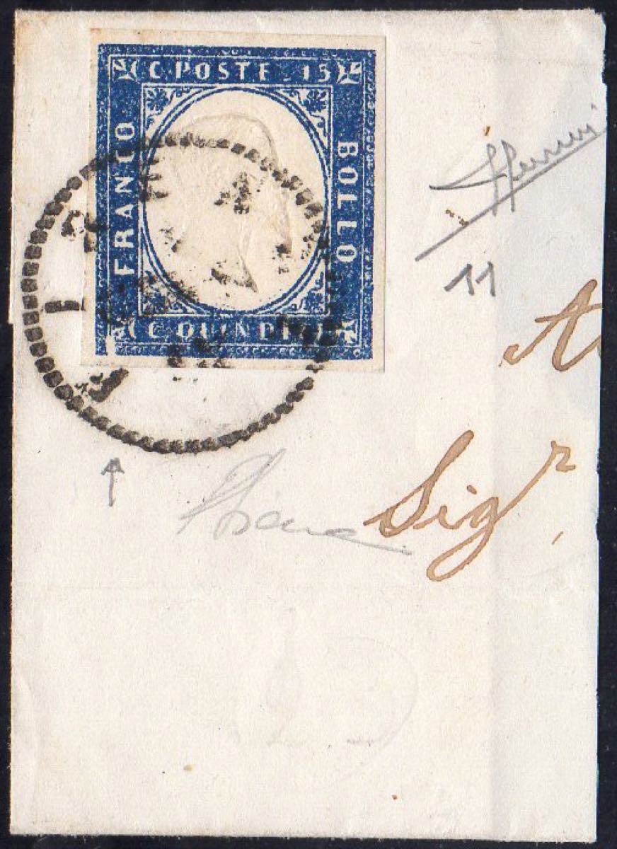 FIRENZE, cerchio formato da punti - 15 cent. tipo Sardegna (11), perfetto, usato su frammento con il bollo datario a cerchio formato da ... Leggi tutto
