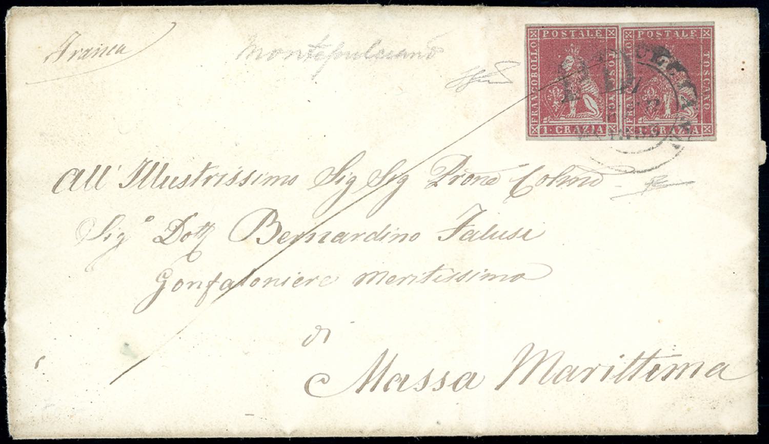 MONTEPULCIANO, doppio cerchio grande + PD coannullatori combinazione non catalogata - 1 crazia (4d), coppia, perfetta, su sovracoperta di lettera del 17/2/1853 per Massa Marittima. R.Diena, Ferrario.