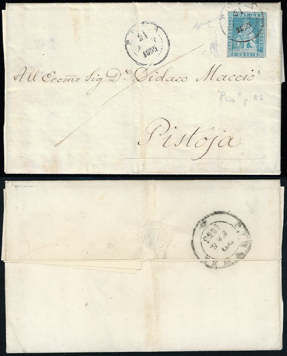 PISA, doppio cerchio piccolo punti R2 - 2 crazie (5), leggermente sfiorato a sinistra, su lettera del 21/2/1855 per Pistoia. Rara! Ferrario.