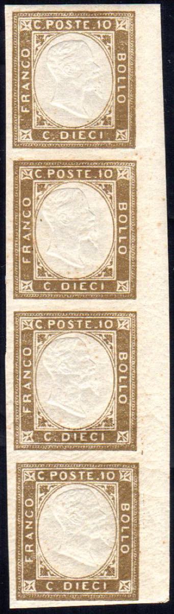 1861 - 10 cent. terra d'ombra, non emesso, striscia verticale di quattro con margine destro di foglio non tosato (2), gomma integra, ... Leggi tutto