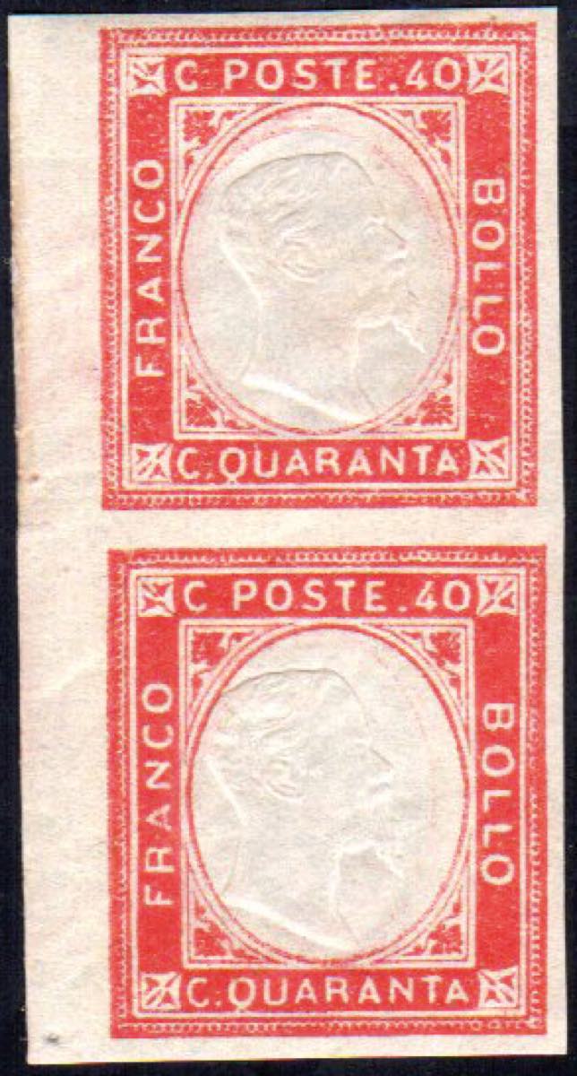 1861 - 40 cent. vermiglio, non emesso (4), coppia verticale con il margine di foglio a sinistra non tosato, gomma integra, perfetta. Rara! Ferrario.